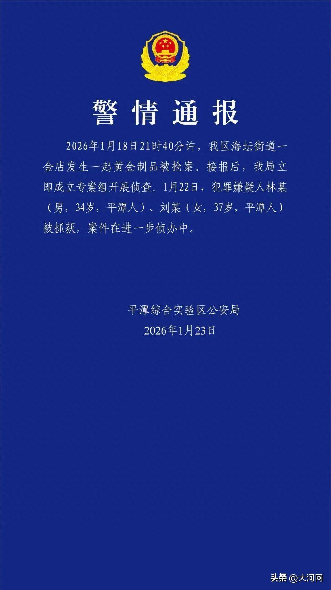 福建平潭详尽推行区公安局1月23日通报:2026年1月18日21时40分许,我区海坛街说念一金店发生全部黄金成品被抢案。接报后,我局立即确立专案组开展考核。1月22日,罪人嫌疑东说念主林某(男,34岁,平潭东说念主)、刘某(女,37岁,平潭东说念主)被握获,案件在进一步侦办中。
